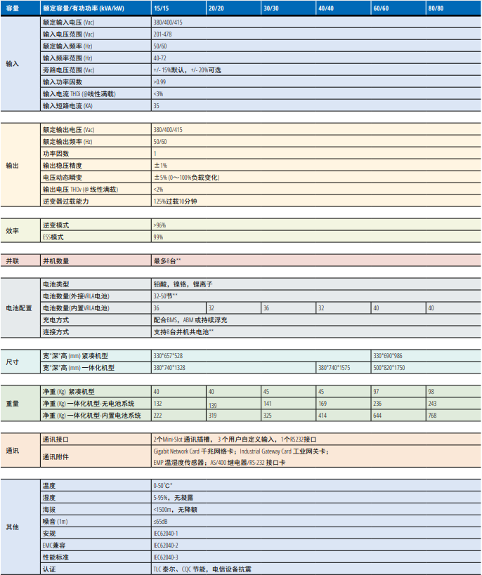 15-80kVA机型支持置电池系统,无需额外安装空间即可满足满载条件下5分钟备电需求