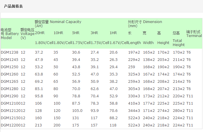 新特性: 1. 前置端子牢固,安全,易安装和易维护; 2. 标准安装设计,便于采用标准19' 和23' 电池柜,窄而高的结构使用其具有良好的散热性能; 3. 16年浮充设计寿命; 4. 独特的提手结构,方便搬运和安装。
